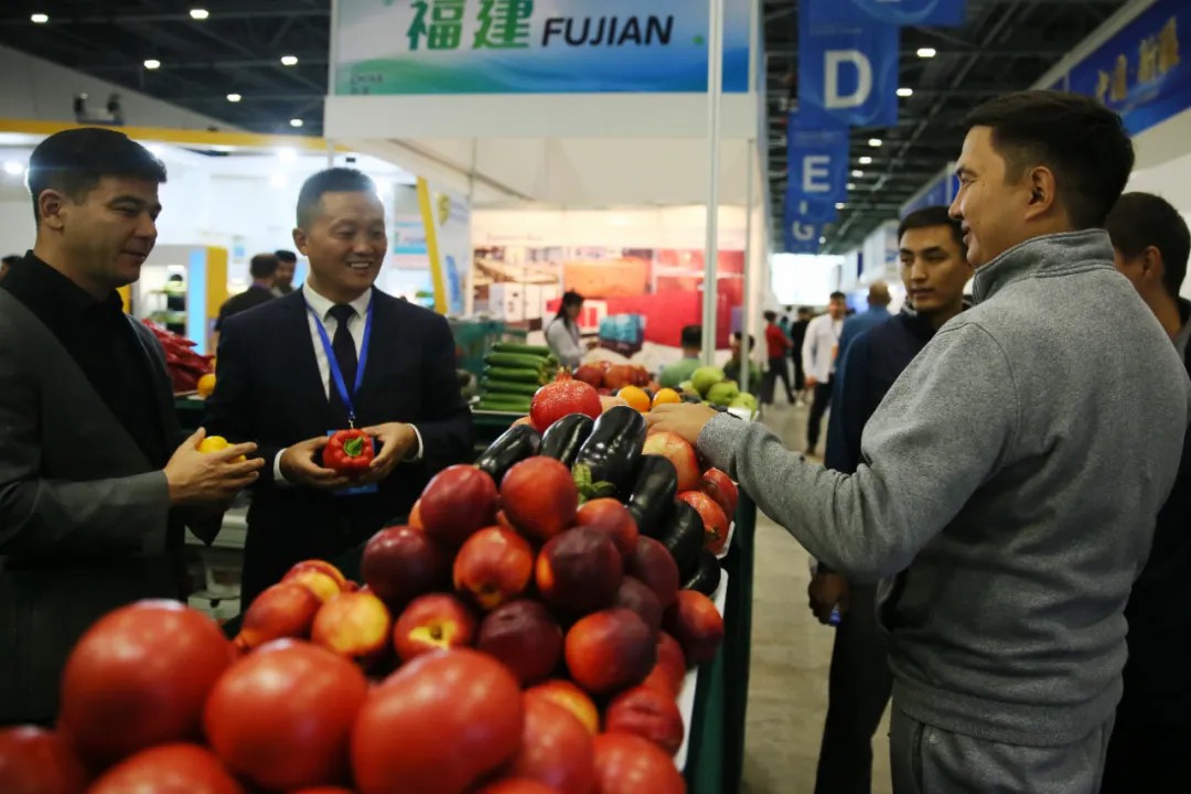当地时间2024年8月23日,第十九届哈萨克斯坦—中国商品展览会在哈萨克斯坦首都阿斯塔纳世博园国际展览中心开幕。图为来自中国的精品果蔬吸引不少观众前来问询。 中新社记者 单璐 摄